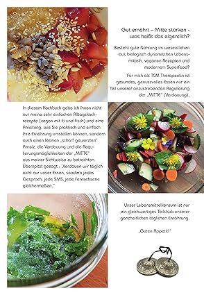 Gut ernährt – die Mitte (Verdauung)stärken – Was heißt das eigentlich? Für mich als TCM Therapeutin ist gesundes, genussvoll Essen nur ein Teil unserer anzustrebender Regulierung der „Mitte“. Unser Lebensmittelkonsum ist nur ein gleichwertiges Teilstück unserer ganzheitlichen täglichen Ernährung. In meinem Kochbuch gebe ich Ihnen nicht nur meine einfachen Alltagsrezepte (vegan mit Ei und Fisch)und eine Anleitung, wie Sie praktisch und einfach Ihre Ernährung umstellen können, sondern auch einen kleinen „scharf gewürzten“ Anreiz , die Regulierung der Mitte aus meiner Sichtweise zu betrachten. Überspitzt gesagt: “ Verdauen wir täglich nicht nur unser Essen, sondern unseren Alltag, jede Handynachricht und jede Fernsehserie gleichermaßen.“